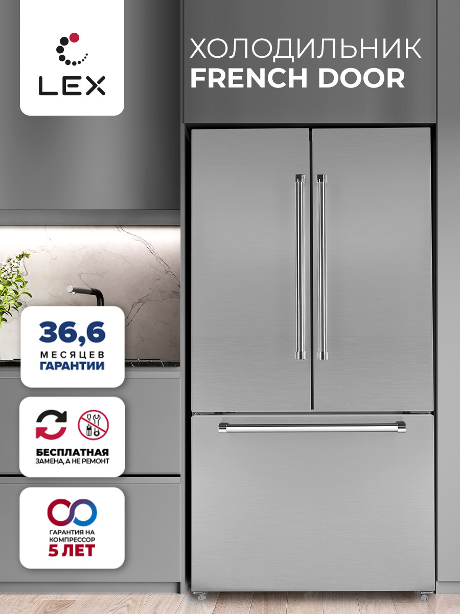 Конструкция French Door дает возможность легко и эффективно хранить продукты в холодильной и морозильной камерах. Модель в черном или стальном цвете прекрасно дополнит практически любой кухонный интерьер.