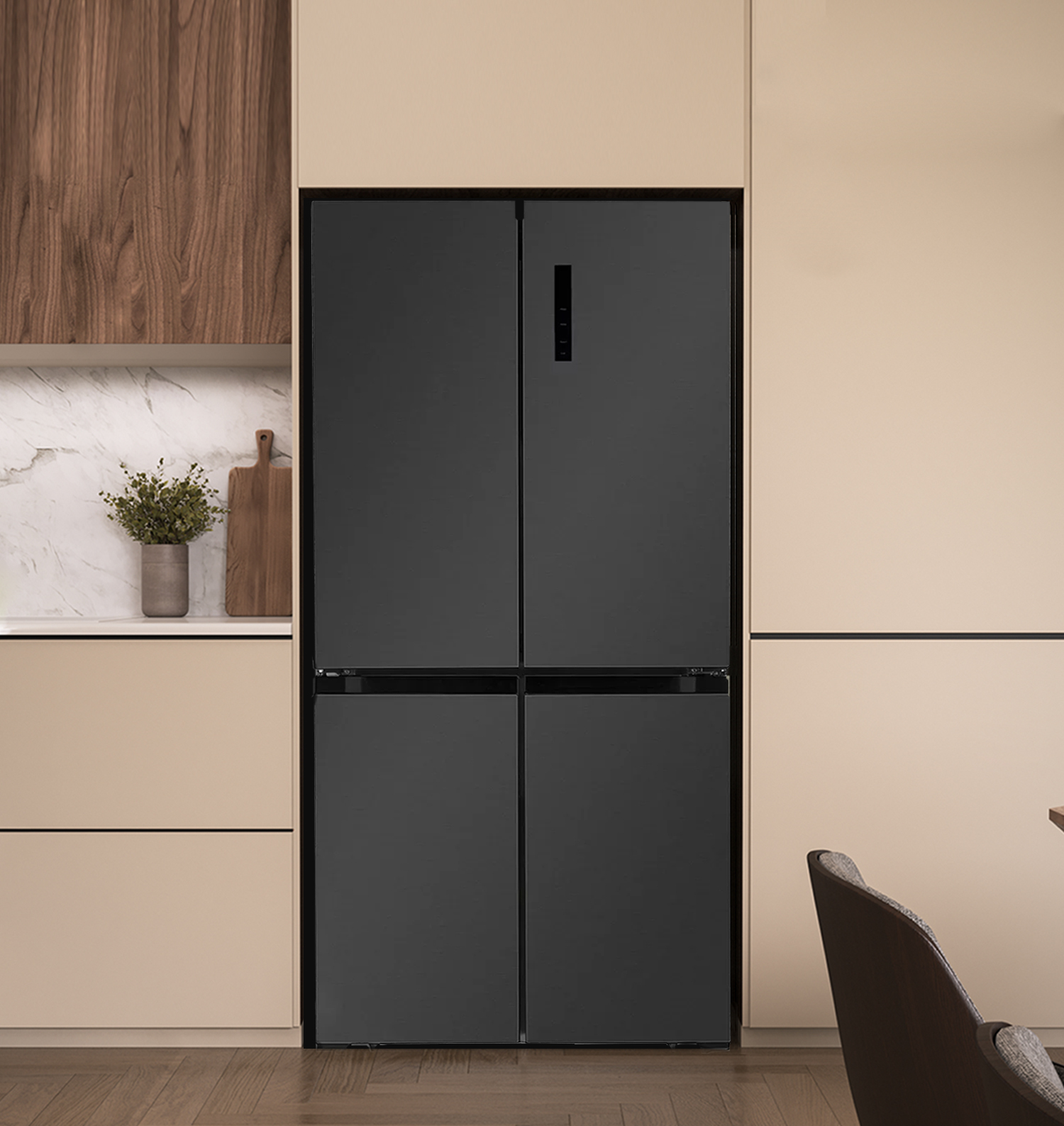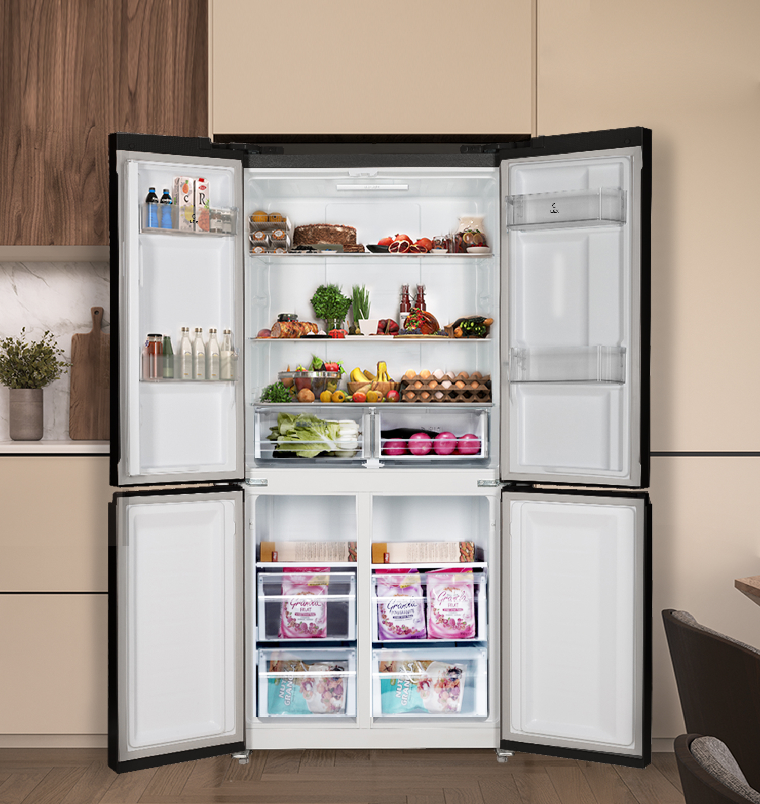 Модель LEX LCD 450 — передовые технологии и множество вариантов дизайна. Удобная панель управления и расположение дверей по типу CROSS DOOR помогут поддерживать нужные параметры хранения для каждого отделения. Холодильник с мощным, экономичным и тихим инверторным компрессором работает по технологии Total No Frost, которая не дает инею скапливаться внутри рабочих камер, значительно упрощая уход за устройством. Запатентованная многопоточная система охлаждения быстро и равномерно распределяет холодный воздух по всем зонам хранения. Модель позволяет хранить продукты при температуре от +8 °С в холодильном отделении до –23 °С в морозильном. А в режиме суперзаморозки можно установить еще более низкое значение: –28 °С. Суперрежимы позволяют максимально охладить содержимое во всех отделениях за короткое время. Это удобно, если вы загружаете сразу много продуктов, например, после похода в супермаркет или отключения электричества. В последнем случае также может пригодиться режим поддержания температуры, который будет работать 10 часов. Еще одна полезная функция — «Отпуск»: когда она активна, в каждой камере устанавливается температура, оптимальная одновременно и для сохранения свежести продуктов, и для уменьшения расхода электричества. Для этого холодильника можно выбрать один из шести стилей матового или глянцевого, стеклянного или металлического корпуса в разных цветах.