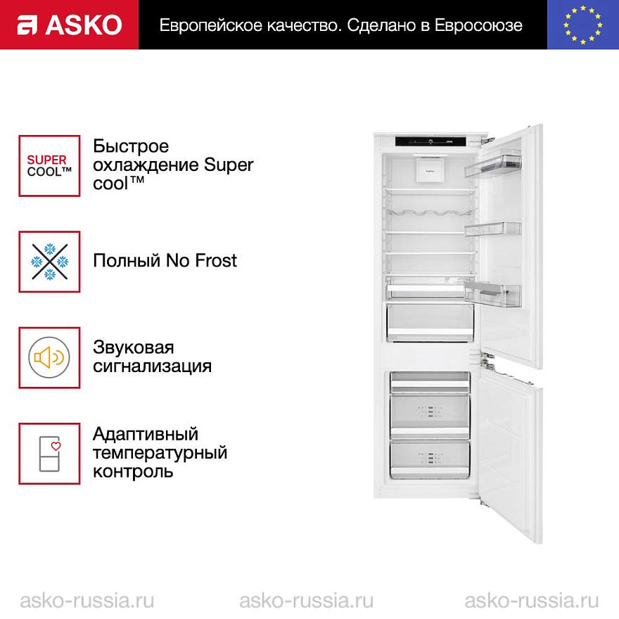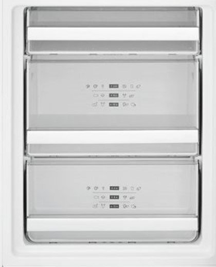 В морозильнике встраиваемого комбинированного холодильника Аско RFN31831i действует система охлаждения NoFrost, предотвращающая образования наледи на стенках и продуктах, поэтому разморозка происходит автоматически. Суперохлаждение SuperCool снизит температуру в основном отсеке, чтобы можно было быстрее охладить свежие продукты. Суперзамораживание Fast Freeze действует схожим образом, но в морозильном отделении. Датчики и сенсоры постоянно замеряют температуру внутри камер. Если адаптивная система выясняет в какое время суток чаще всего открывается дверца, то она автоматически снижает температуру к этому периоду. Она также самостоятельно регулирует процесс выработки холода в зависимости от наружной температуры помещения.