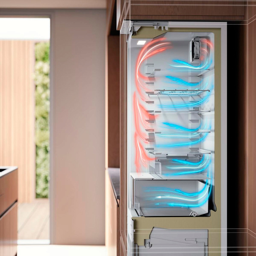 Двойной контур позволяет обоим отделениям работать независимо друг от друга. Это помогает точно настраивать температуру для каждой камеры, а запахам — не смешиваться. Встроенный вентилятор CoolFlow равномерно распределяет холод по всему объёму, а ионизатор FreshAir уничтожает лишние запахи и бактерии. Контейнер для Freshbox с контролем влажности создаёт оптимальный микроклимат для растительной пищи, что позволяет овощам и фруктам дольше оставаться свежими. Специальная металлическая полка рассчитана на вес в 13 кг. Это 9 бутылок по 0,75 литра или 18 алюминиевых банок с напитками.