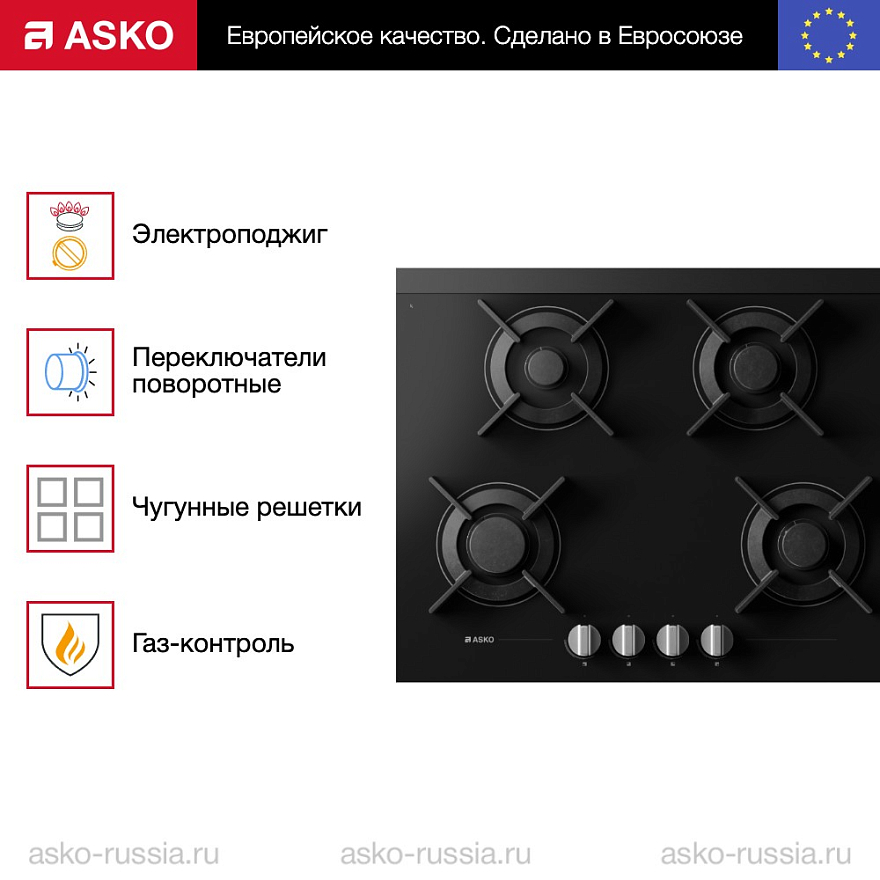 Предусмотрена система газ-контроль. Эта функция автоматически прекращает подачу газа к горелкам, если пламя гаснет из-за случайного воздействия, например, при пролитии жидкости или порыва ветра. Система газ-контроля Аско HG8640BGB1 работает просто: в каждой горелке установлен специальный датчик, который реагирует на наличие пламени. Если огонь гаснет, он остывает и передает сигнал на клапан, который перекрывает подачу газа. Таким образом, исключается возможность утечки газа и возникновения опасных ситуаций, связанных с его использованием. Функция газ-контроль особенно полезна в случаях, когда необходимо покинуть кухню на некоторое время, не опасаясь, что пламя на плите погаснет или произойдут другие неприятности. Также варочная панель оборудована электроподжигом — огонь появляется, стоит только особым образом надавить на переключатель.