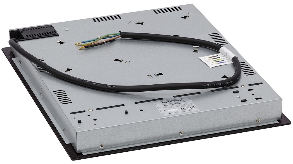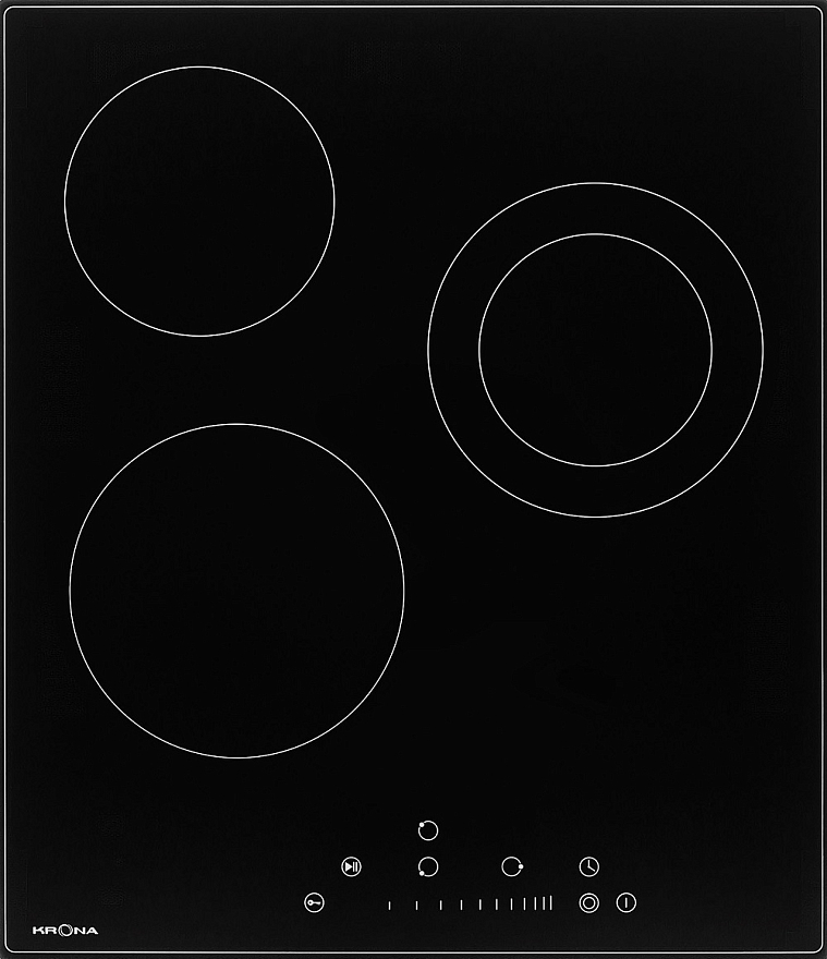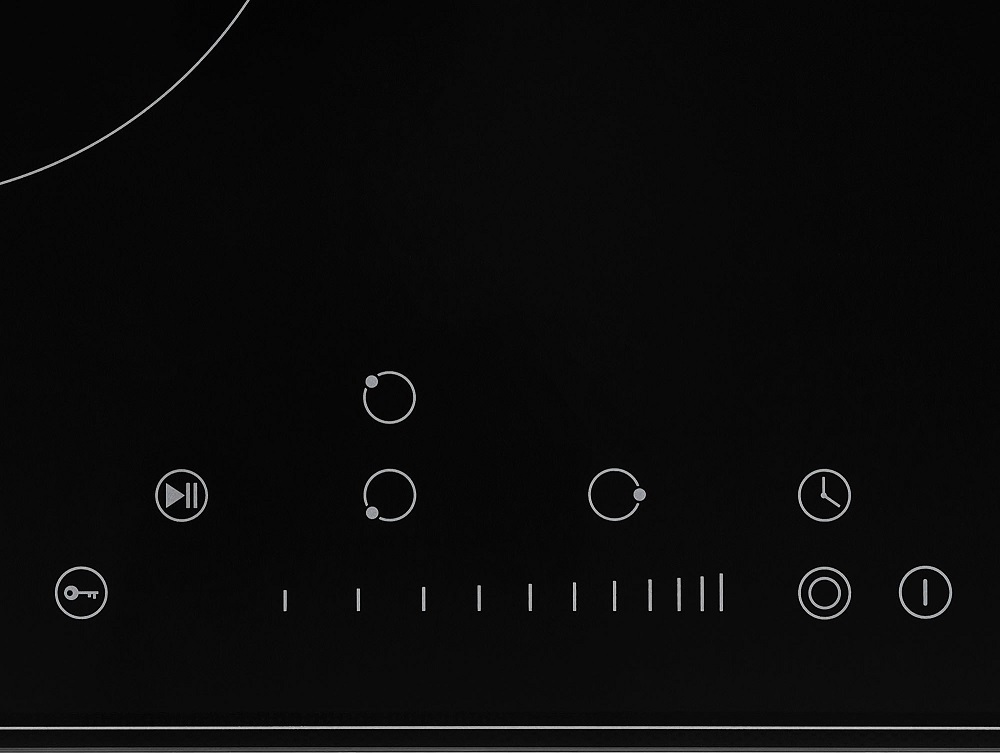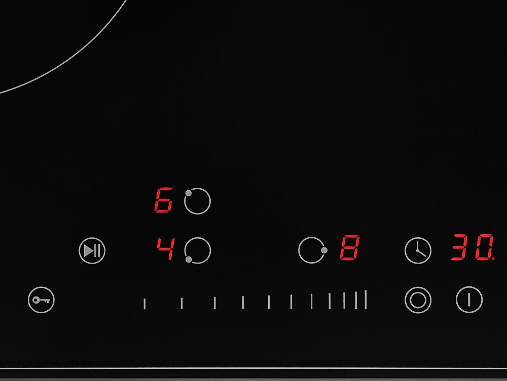 На варочной поверхности шириной 45 см расположено 3 конфорки. Одна из них — так называемая двойная корона, т.е. распространяет энергию равномерно и быстро. Таймер позволяет выставить длительность приготовления от 1 до 99 минут. Затем автоматически отключает прибор. А пауза Stop&Go прерывает на несколько минут всю работу. После повторного нажатия, она возобновляется.