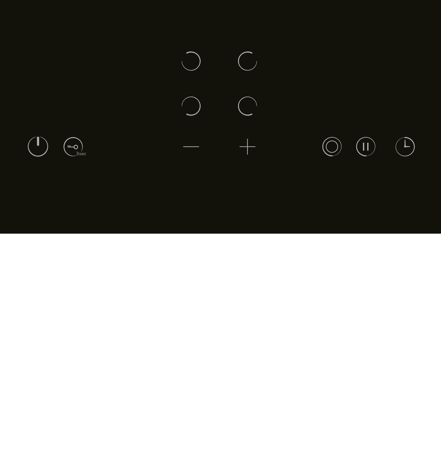 Одноконтурная конфорка 2 х 1200 Вт (Ø 165 мм), 1 х 1800 Вт (Ø 200 мм.) Двухконтурная конфорка 1 × 1000/2200 Вт, Ø 138/230 мм