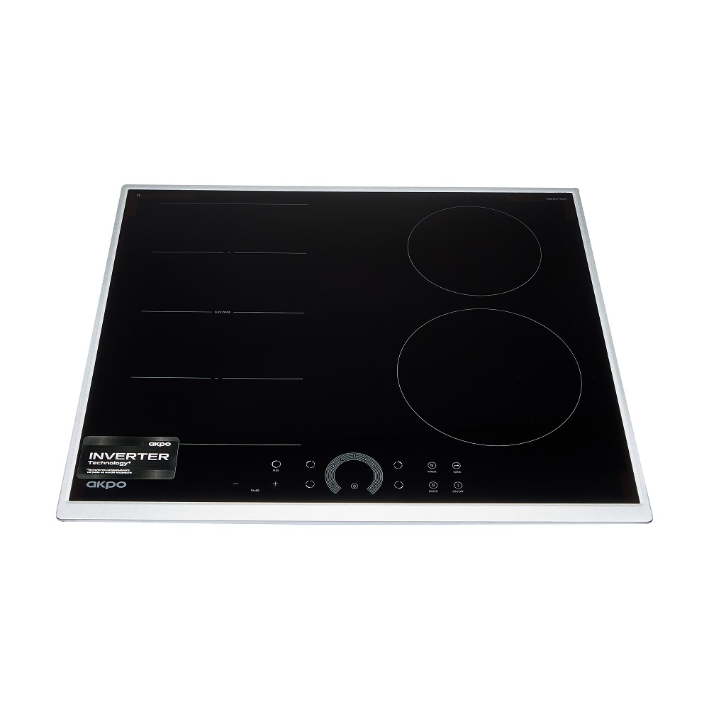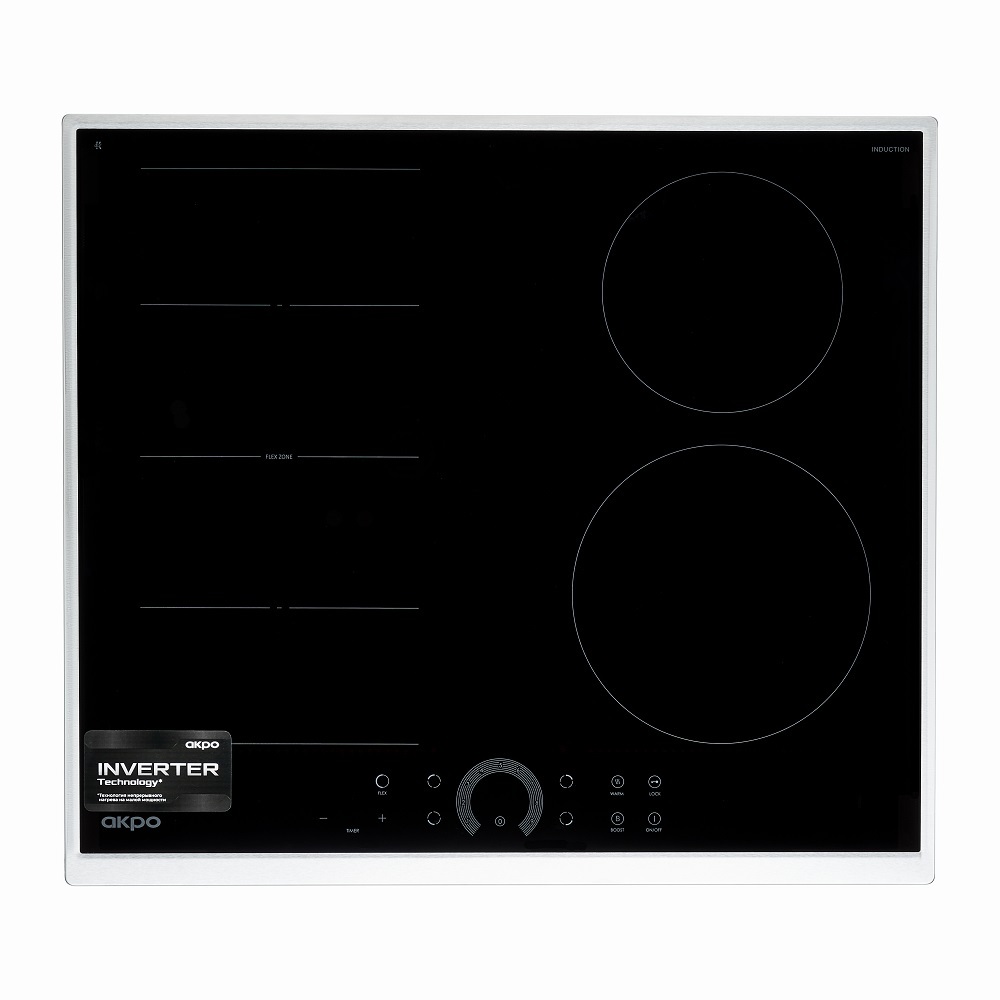 Варочная индукционная поверхность польского бренда AKPO (АКПО) c инверторным нагревом на всех уровнях мощности, слайдерным сенсорным управлением, 4 зонами нагрева и FLEX-зоной, а также функцией Booster, таймером и режимом сохранения тепла.