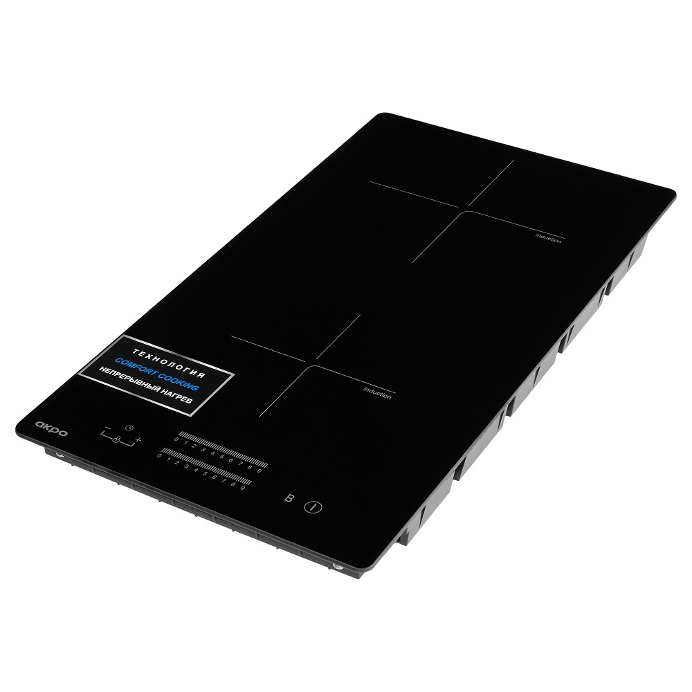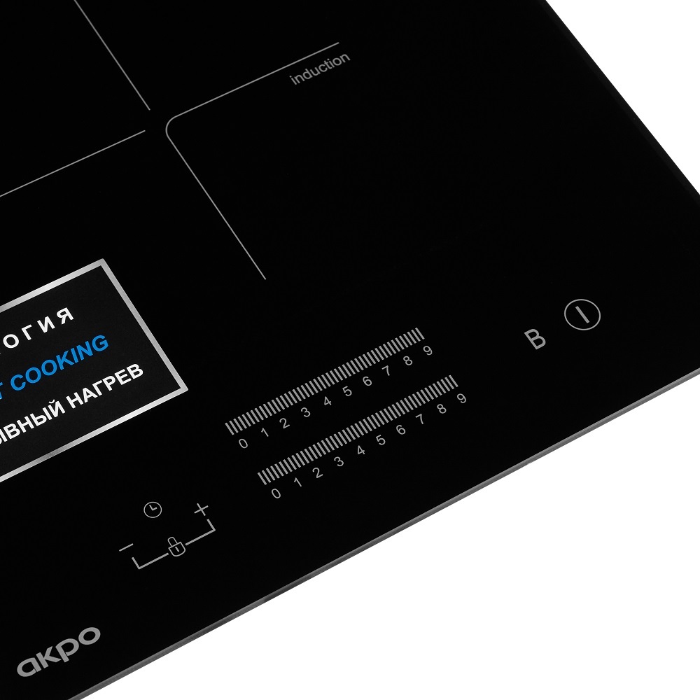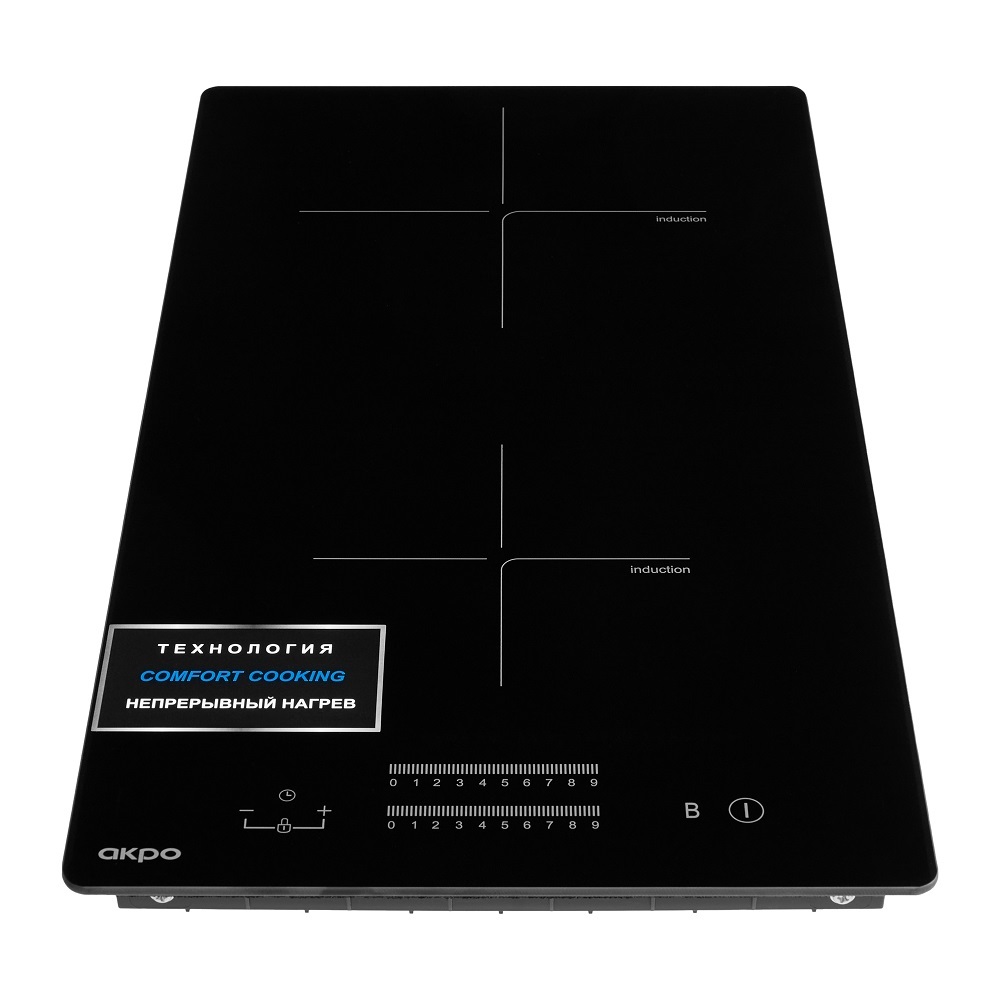 Индукционная инверторная варочная поверхность польского бренда AKPO (АКПО), с 9 уровнями мощности, осуществляющая постоянный нагрев на малой мощности, функцией Booster, сенсорным слайдерным управлением для каждой зоны, индикатором остаточного тепла и таймером отключения.