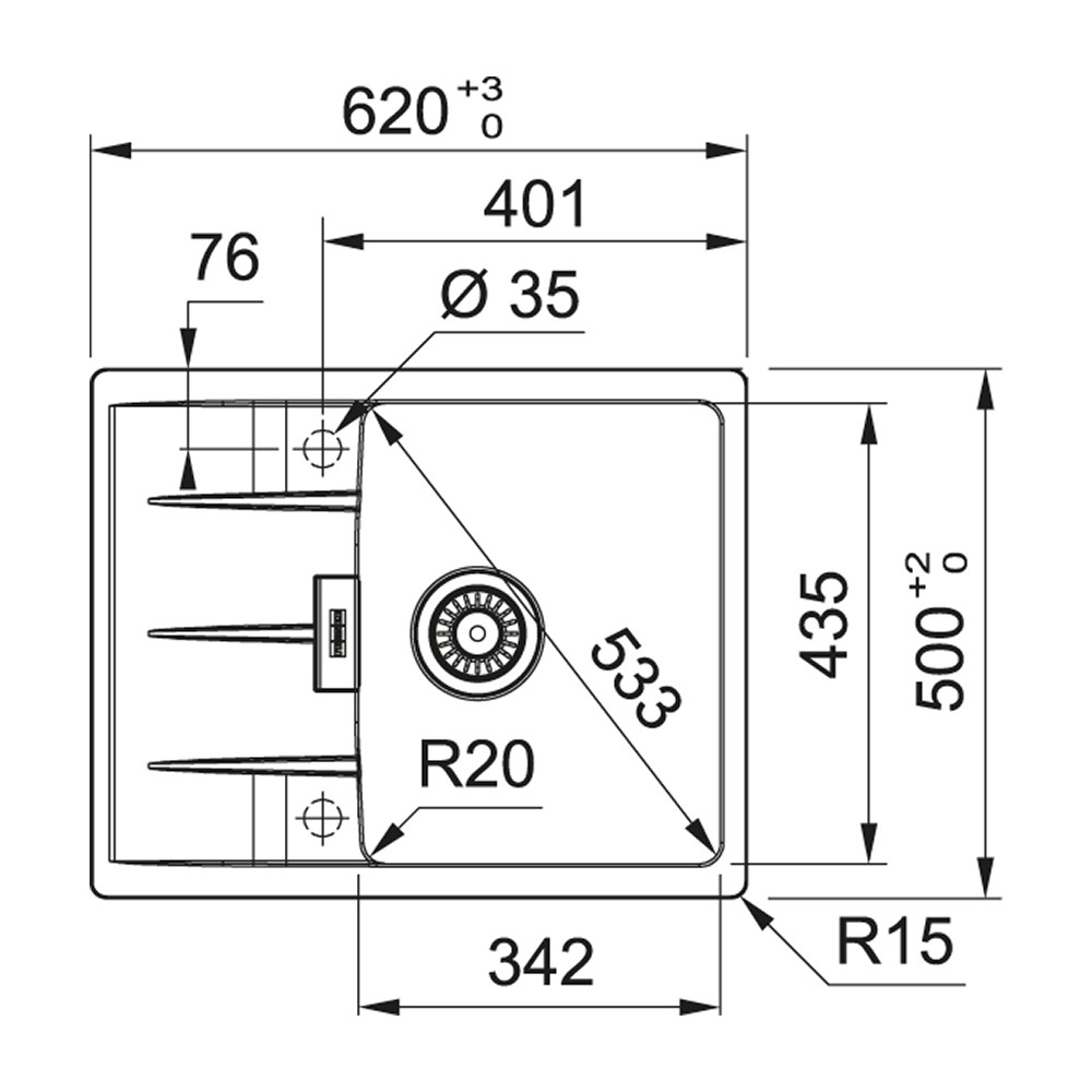 Вырез для монтажа сверху: 586 x 466 мм, R 15 мм