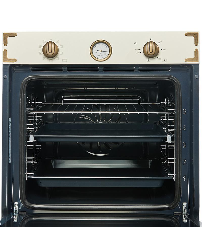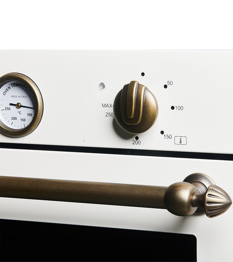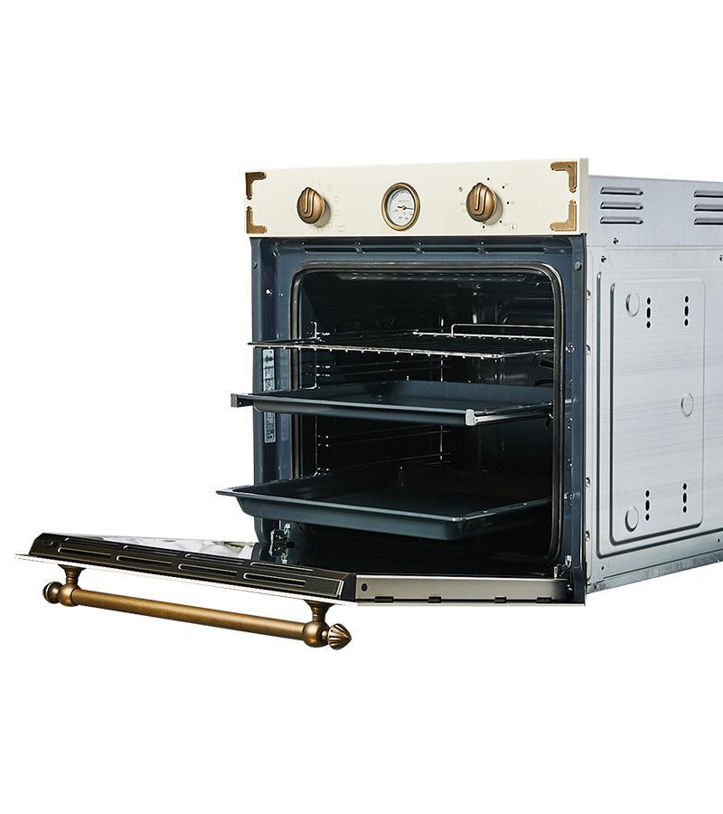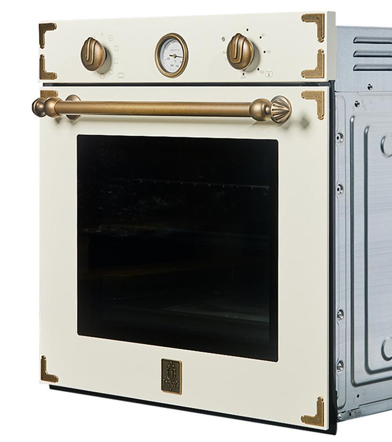 Этот итальянский элегантный электрический духовой шкаф в стиле барокко дополнит Ваш стилизованный интерьер и станет любимицей среди бытовой техники на Вашей на кухне. Эта вместительная духовка объёмом 76 л., имеющая 9 функций нагрева, позволит экспериментировать в приготовлении блюд разной сложности.