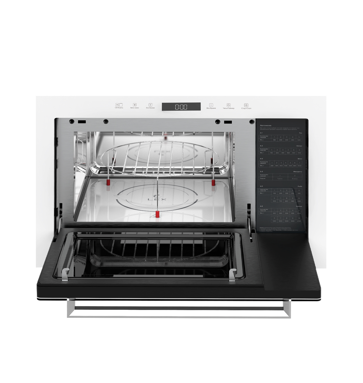 Дно, покрытое керамическим слоем, позволяет волнам распределяться равномерно, обрабатывать продукты со всех сторон. Отсутствие столика даёт возможность использовать вместительную посуду и противни , квадратные и прямоугольные тарелки при объеме камеры приготовления 25 литров.