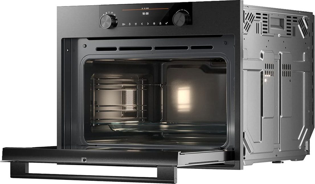 Освещение внутри камеры двухстороннее, что обеспечивает отличное освещение при приготовлении блюд. Дверца оборудована тремя стеклами и функцией холодного фронта Microwave CoolDoor. Это обеспечивает безопасность использования и предотвращает перегрев.