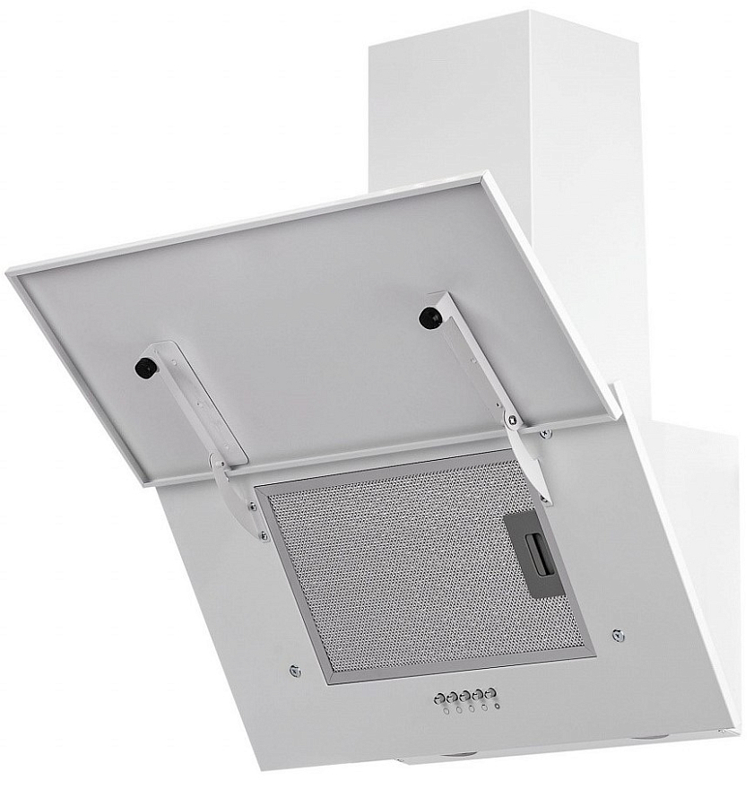 Наклонная модель работает на трех скоростях, переключение между которыми осуществляется путем нажатия кнопок на корпусе, этот тип управления прост и интуитивно понятен. Светодиодная подсветка может использоваться как дополнительный источник света в вечерний период. Специальный антивозвратный клапан не позволит неприятным запахам вернуться на кухню во время простоя устройства.