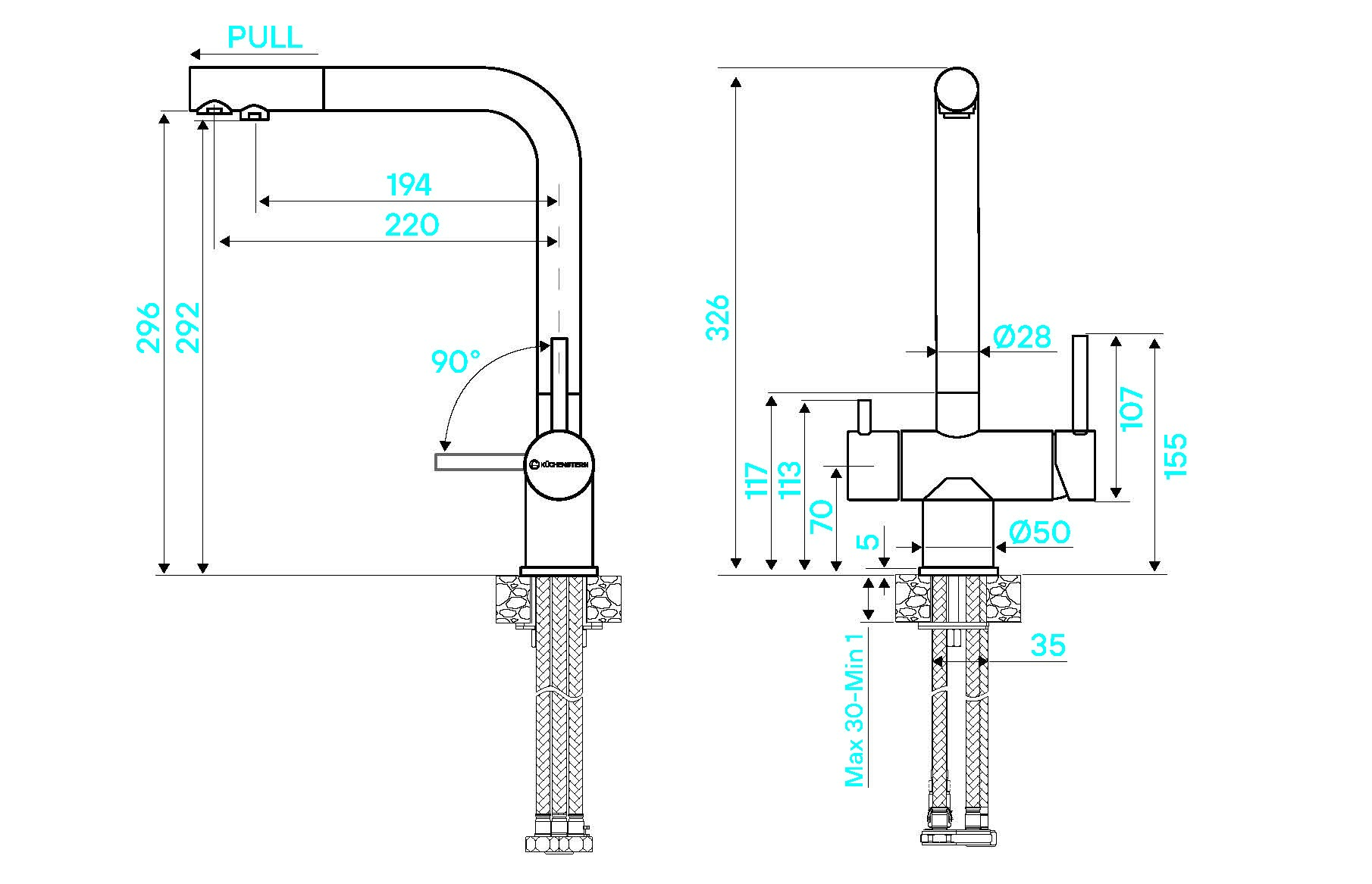 Смесители из стали SUS 304 отличаются превосходной прочностью, антикоррозийной стойкостью прочностью к механическим повреждениям, устойчивостью к резким перепадам температур, абсолютной пищевой безопасностью Неоспоримым преимуществом смесителейиз стали SUS 304 является эстетичный и современный внешний вид Цветные модели KÜCHENSTERN с PVD покрытием обладают повышенной износостойкостью, устойчивостью к агрессивным химическим веществам, что делает их максимально долговечными Даже при интенсивном использовании покрытие PVD не тускнеет и не теряет своего привлекательного внешнего вида на протяжении многих лет В процессе PVD не используются вредные химикаты, поэтому смесители экологически безопасны. Смеситель KÜCHENSTERN FOKUS-FS объединяет сразу две функции - питьевая и обычная вода из одного смесителя. Смесителем удобно пользоваться , так как он имеет два отдельных рычага управления для водопроводной и фильтрованной воды.