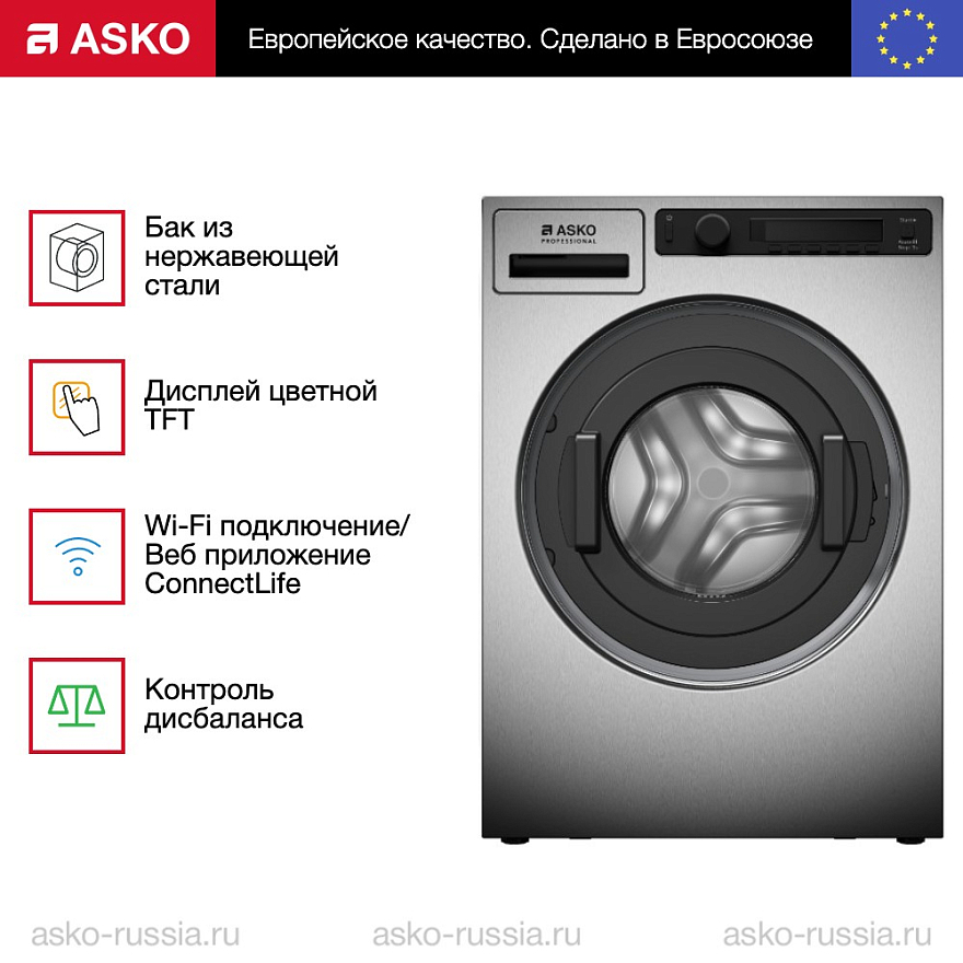 Профессиональная стиральная машина Asko WMC8947PI.S имеет 26 программ и опций для качественной стирки, полоскания и отжима при температуре от 20 до 90 градусов. Электронный дисплей позволяет установить и отслеживать ход автоматических программ, в которые могут добавляться удобные опции для увеличенного или уменьшенного по времени или температуры процесса. Для людей, чувствительных к порошкам и маленьких детей применяется гипоаллергенная стирка с дополнительным полосканием. Есть вариант продезинфицировать бельё на высоких температурах. Можно отложить время старта на несколько часов.