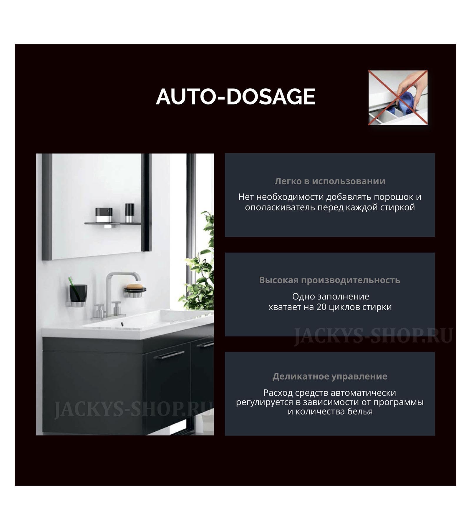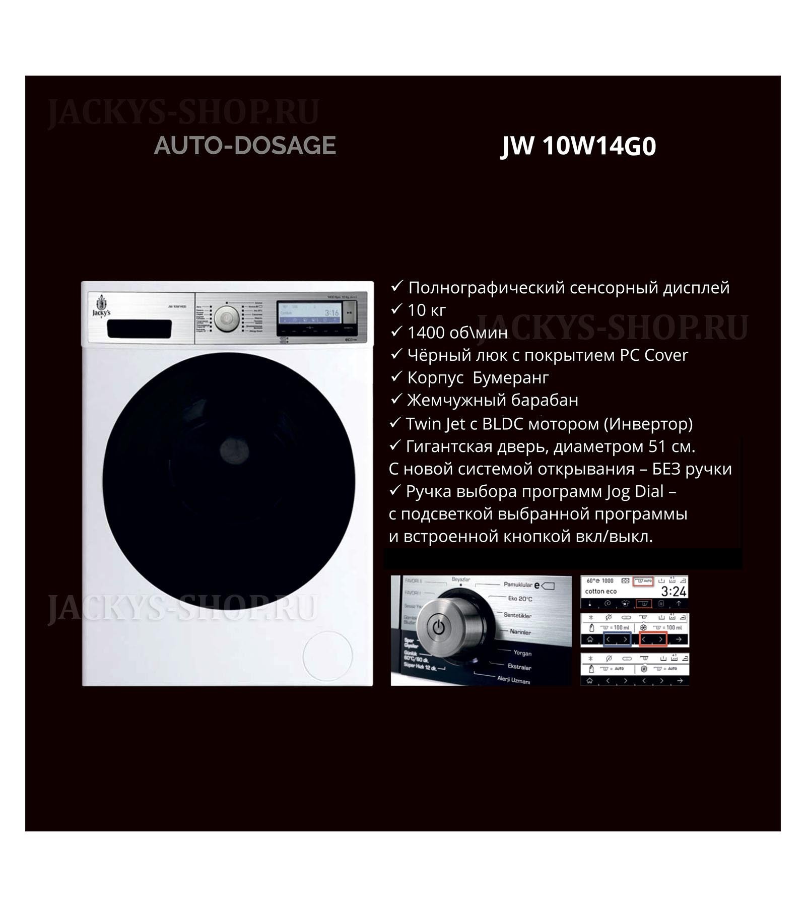 Разные структуры загрязнений требуют различных режимов стирки. Но не каждый бренд может предложить настолько широкий спектр режимов, как бренд “Jackys”. Потребитель всегда может выбрать самую подходящую среди 22 видов, в зависимости от типа загрязнений и пятен, что позволит легко отстирать бельё и получить одежду в безупречном виде.
